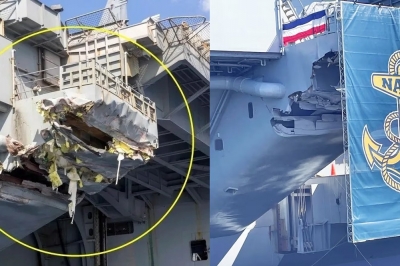 [포착] 트럼프 볼까 봐…美 항모 트루먼 호, 파손 부위 못 고치고 현수막 은폐