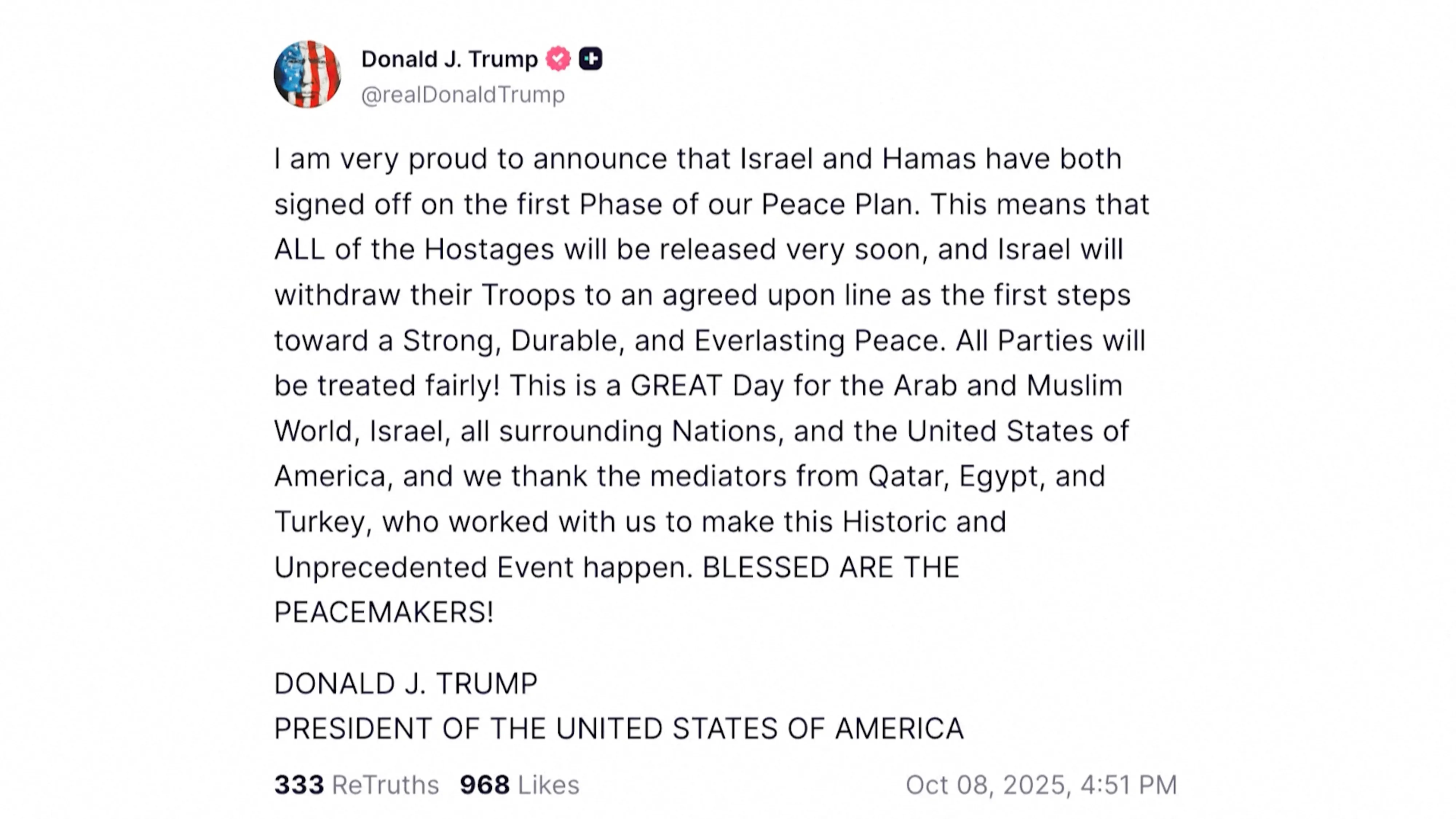 이어 “오늘은 아랍 및 이슬람 국가, 이스라엘, 모든 주변국, 미국에 있어 매우 위대한 날”이라며 “역사적이고 전례 없는 일이 가능하도록 우리와 협력한 카타르, 이집트, 튀르키예의 중재자들에게 감사드린다”고 강조했다. “모든 당사자는 공정하게 대우받을 것”이라며 “평화를 만드는 사람들에게 축복이 있기를!”이라고도 덧붙였다.