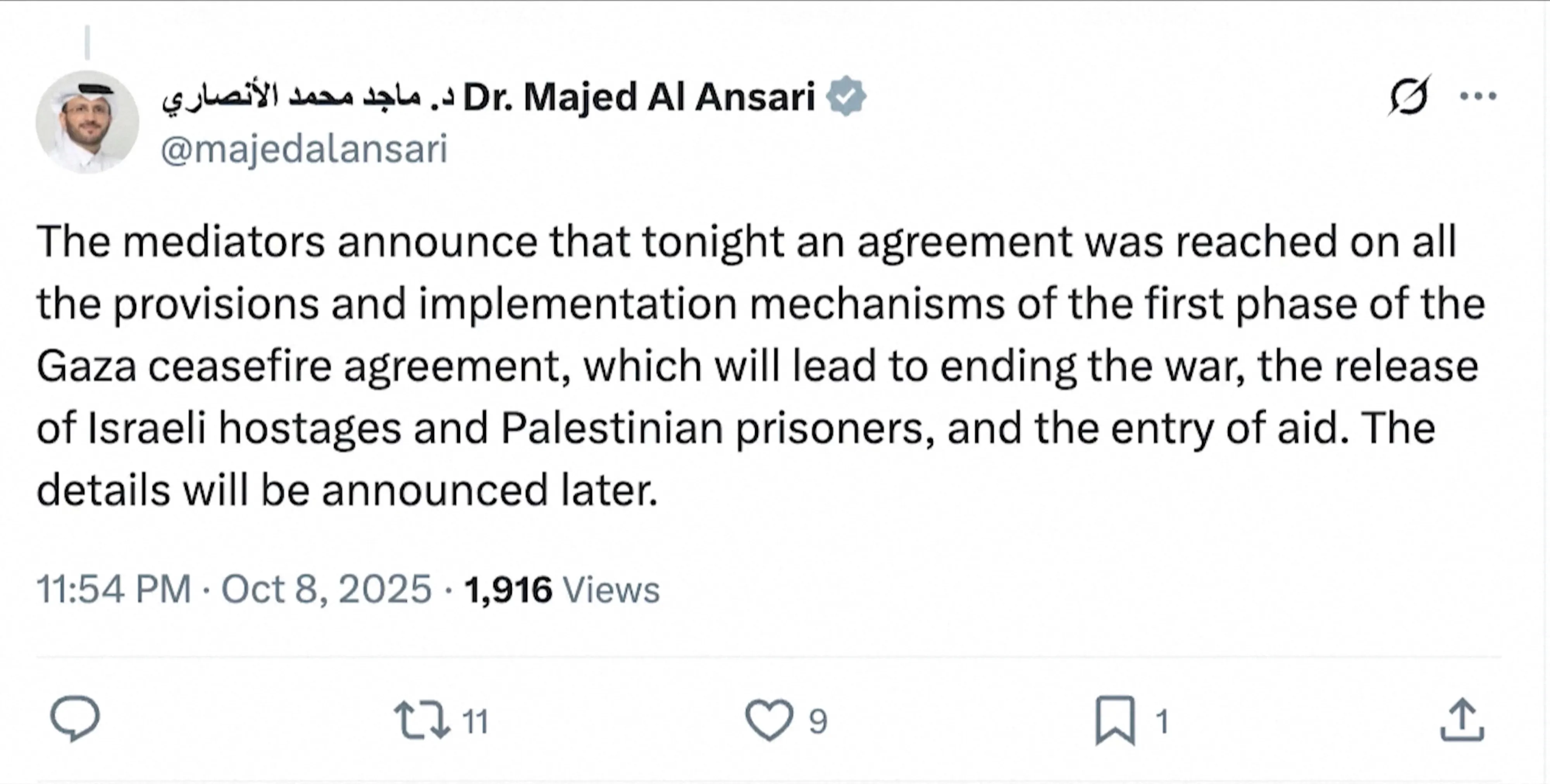 중재국 카타르의 마지드 알 안사리 외무부 대변인은 엑스(X·옛 트위터)를 통해 “중재자들은 오늘 밤 가자 휴전 협정 1단계의 모든 조항과 이행 절차에 대한 합의가 이뤄졌음을 발표한다”고 밝혔다. 그는 “이는 전쟁 종식, 이스라엘 인질과 팔레스타인 수감자 석방, 인도적 지원 반입으로 이어질 것”이라며 세부 사항은 추후 발표될 예정이라고 설명했다.