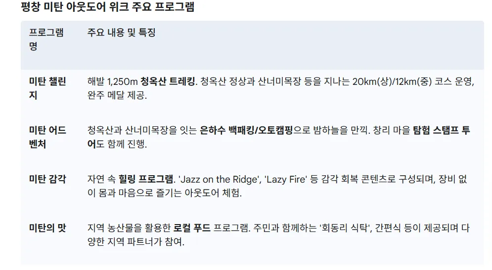 이번 행사는 지난 8월 7일 공식 출범한 주민 주도의 미탄 아웃도어 빌리지 협의체가 주관하는 첫 프로젝트다. 평창군과 미탄주민자치회, 산너미목장, 와우미탄 등 지역 단체와 청년 창업가들이 기획과 운영에 힘을 모았다. 청옥산과 백두대간의 자연 환경을 무대로 다양한 아웃도어 프로그램을 선보인다.