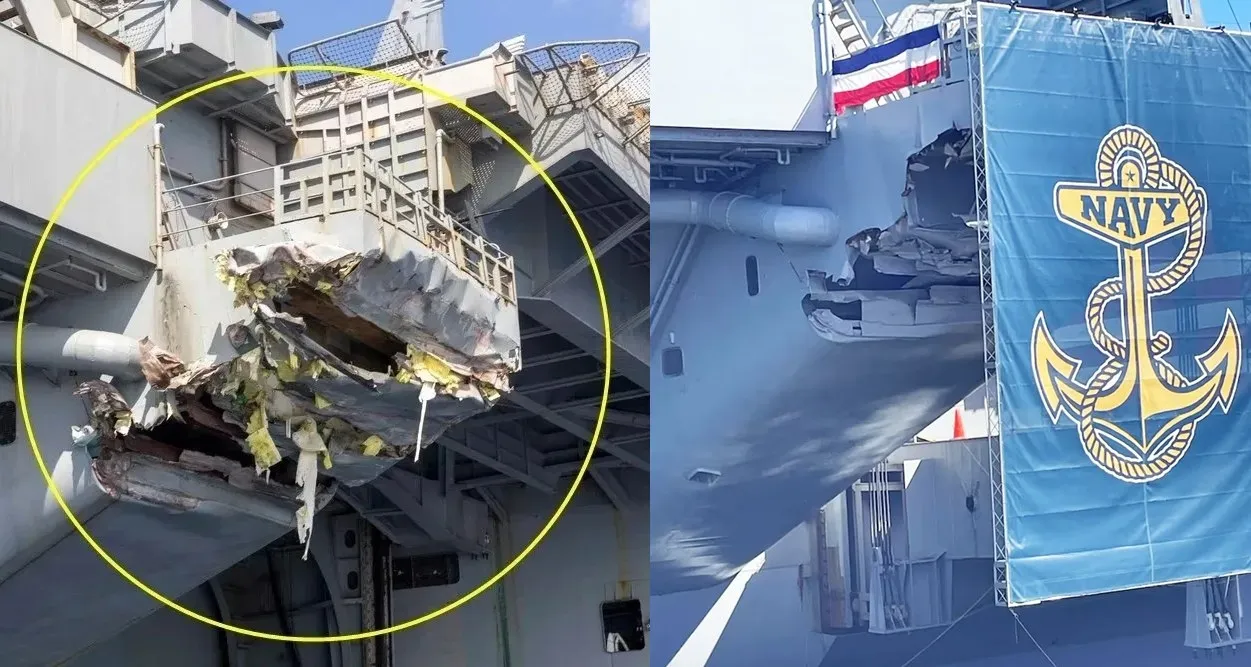지난 2월 지중해에서 상선과 충돌해 일부 파손된 미국 해군 항공모함 ‘USS 해리 S. 트루먼 호’가 여전히 수리가 되지 않은 것으로 알려졌다. 지난 10일(현지시간) 미 군사 전문 매체 더워존 등 현지 언론은 트루먼 호가 손상된 부분을 현수막으로 가린 채 행사에 참여했다고 보도했다.