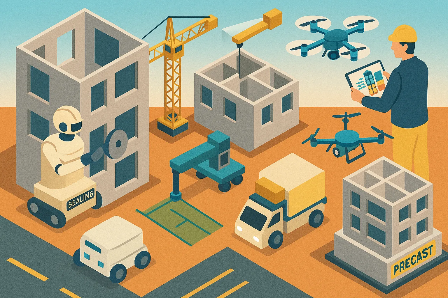 특히 대규모 작업 공간의 효율을 높이는 로봇들이 등장할 것이다. 넓은 바닥의 정확한 도면을 그려주는 먹매김 로봇, 골조 공사 후 알루미늄 거푸집을 해체하는 로봇, 외벽 도장 및 창호 주변 코킹(Sealing) 로봇 등이 실용화된다. 자율 이동 로봇(AGV: Automated Guided Vehicle)을 활용한 자재 운반 로봇 등 다양한 기계와 로봇들이 현장 인력의 역할을 분담하게 된다.