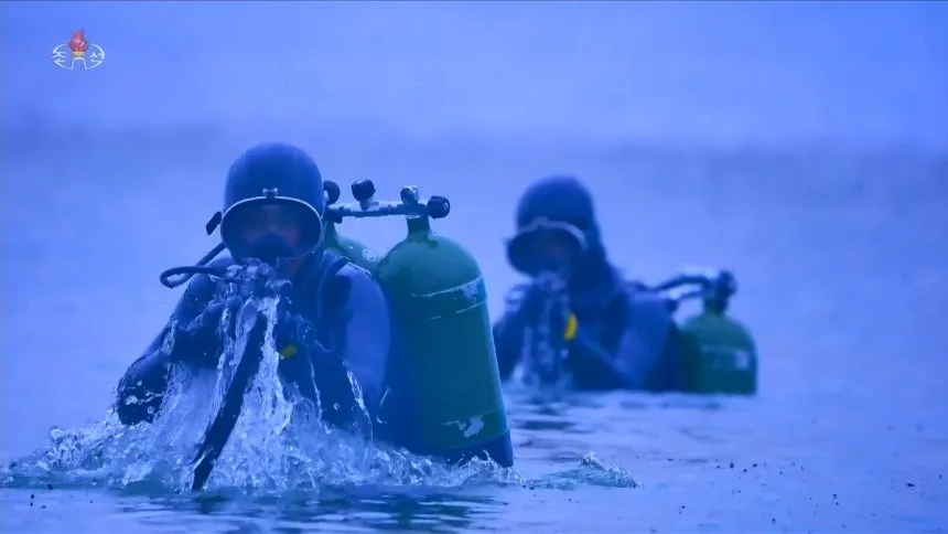 해당 영상에는 잠수함에서 은밀히 빠져나온 병력이 바닷물에서 떠올라 사격하는 모습도 담겼다.