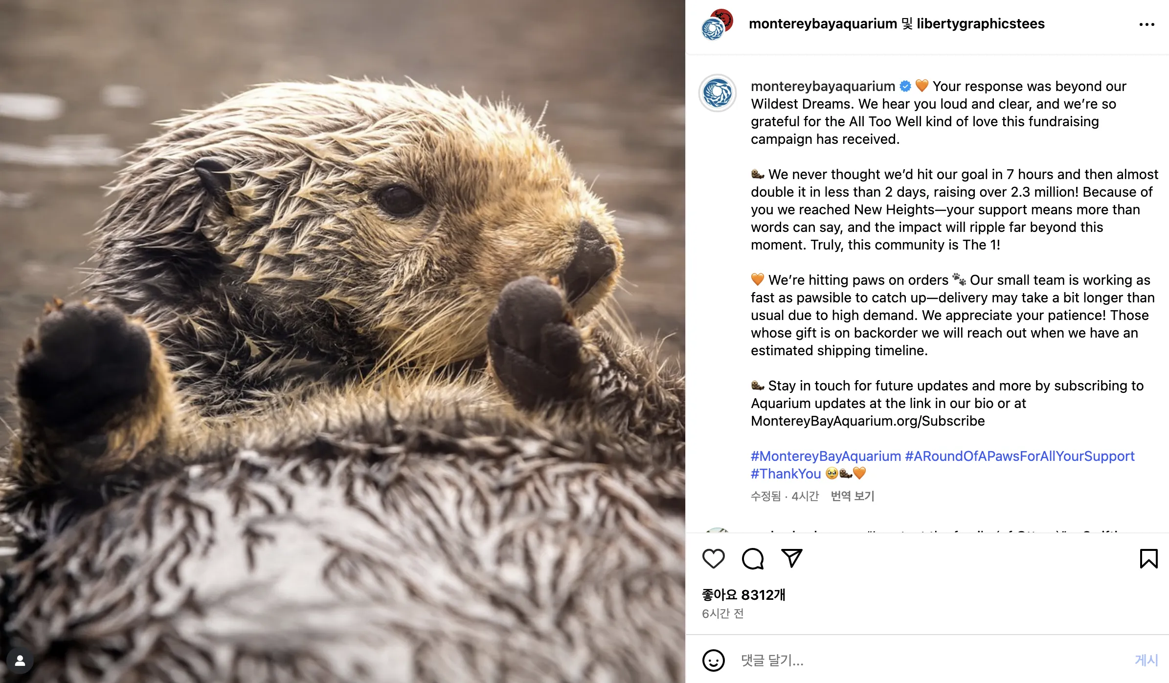 기부 방식은 최소 65.13달러(약 9만 3천원)를 내면 다치거나 부모를 잃은 해달을 돕는 기금과 함께 티셔츠를 증정하는 형태였다.
