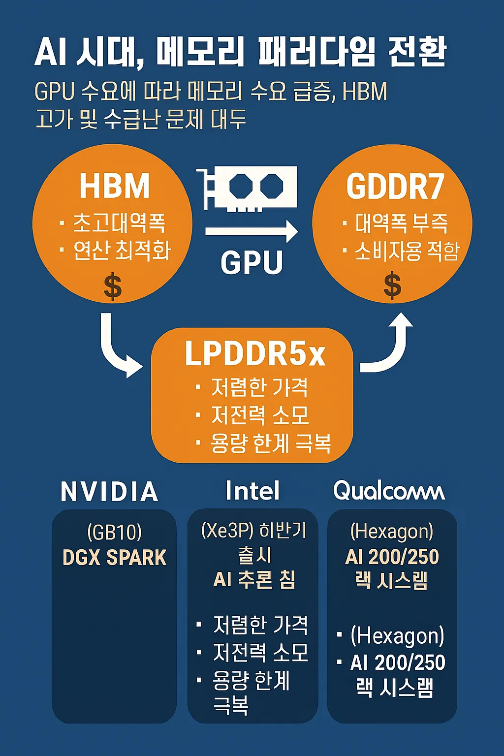 LPDDR5x 메모리는 저렴하고 전력 소모가 적어 개인용 AI PC 같은 틈새시장을 노리는 엔비디아 DGX 스파크에는 최적의 선택입니다. 하지만 이 분야의 후발 주자인 인텔이나 퀄컴이 데이터센터 시장을 노리고 LPDDR5x 메모리를 채택한 배경에는 다른 이유가 있어 보입니다. 가장 큰 이유는 가격과 수급 문제일 가능성이 높습니다.