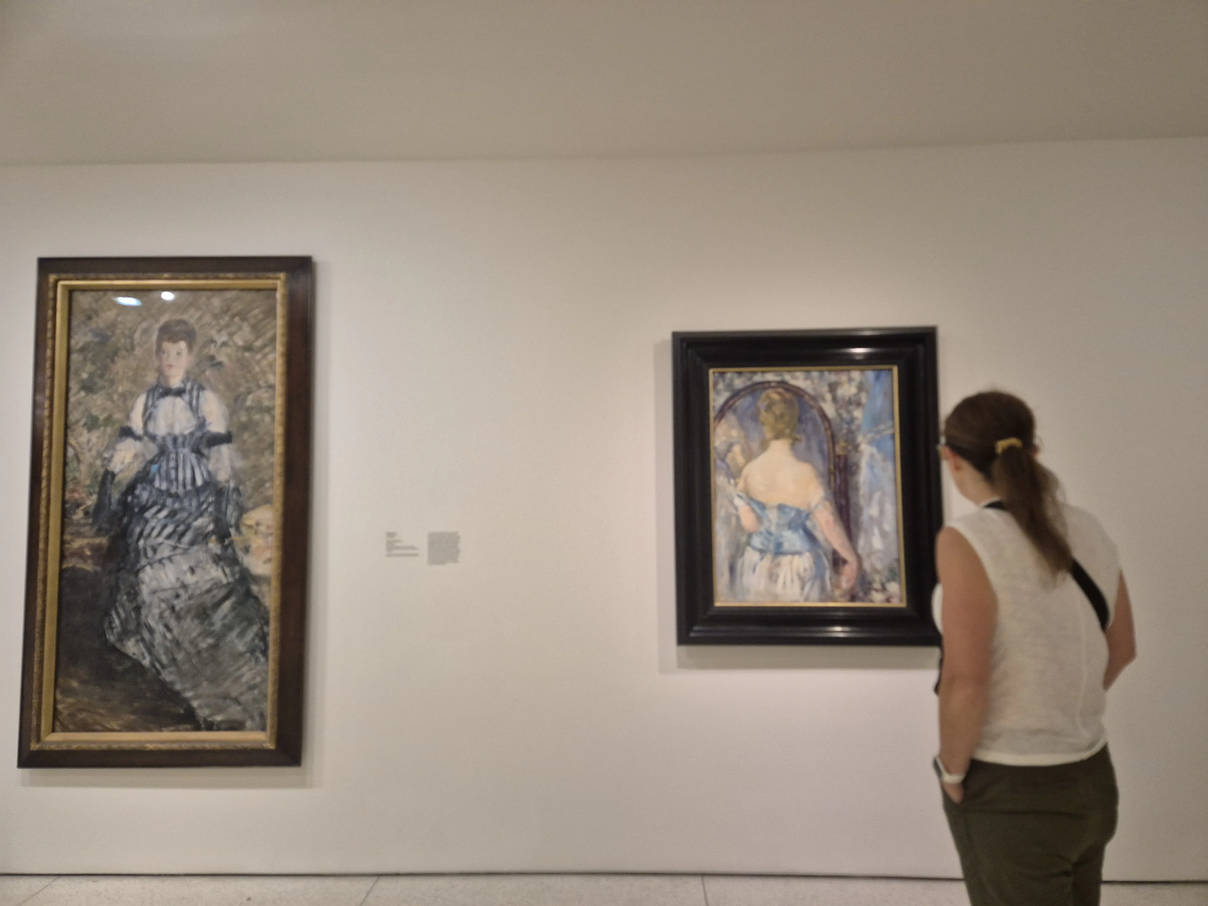 화면의 중심을 차지한 여성은 관람자를 등지고 있다. 마네는 그녀의 얼굴을 숨기고, 오직 뒷모습과 거울이라는 장치를 통해 그녀의 시선을 상상하게 만든다. 여기서 가장 흥미로운 점은 거울에 비친 모습이 흐릿하고, 심지어 얼굴이 명확하게 비치지 않는다는 사실이다.
