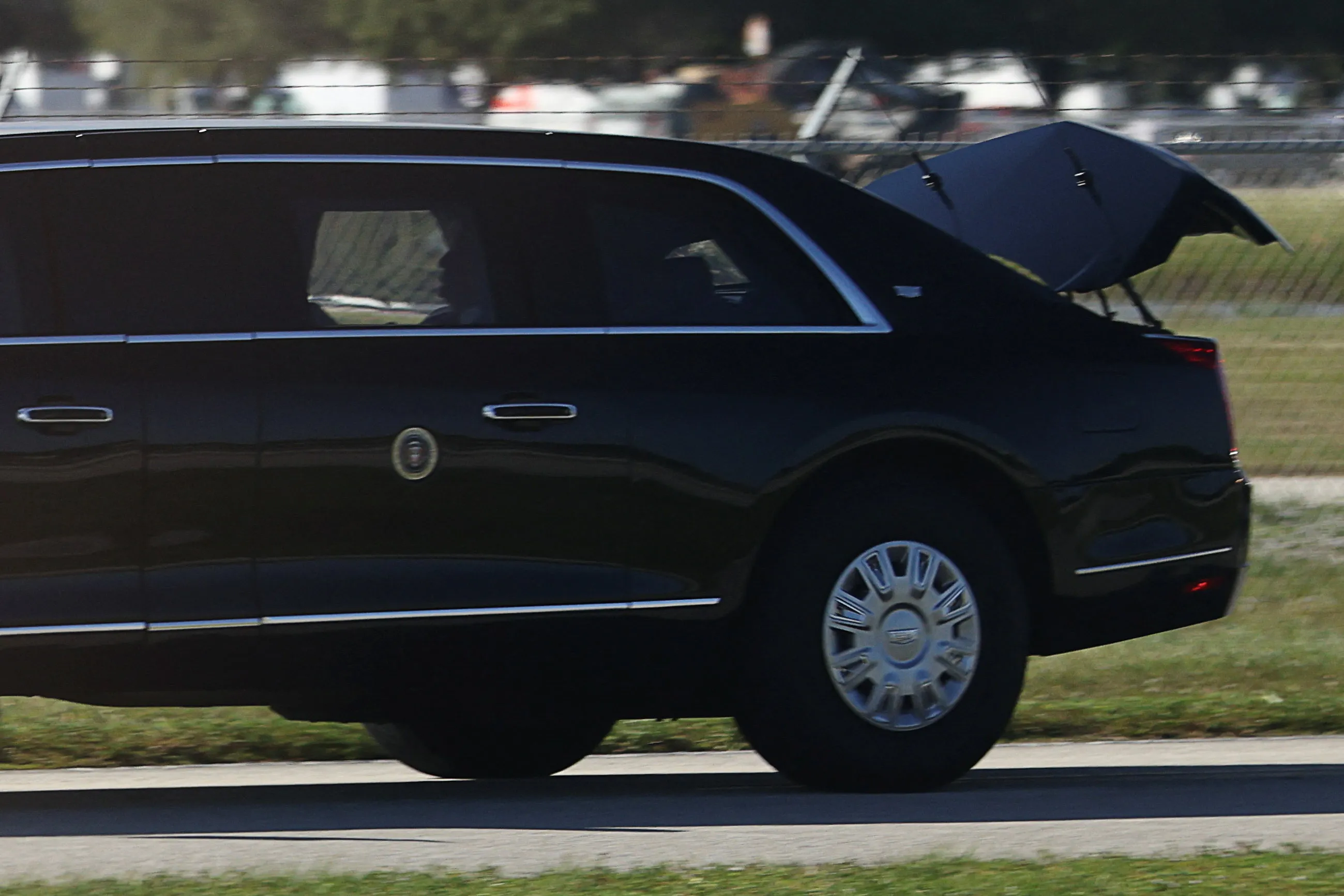 도널드 트럼프 미국 대통령이 9일(현지시간) 플로리다 팜비치 국제공항으로 이동하던 중 탑승한 전용 리무진 ‘더 비스트’의 트렁크가 열린 채 달리는 장면이 포착됐다.