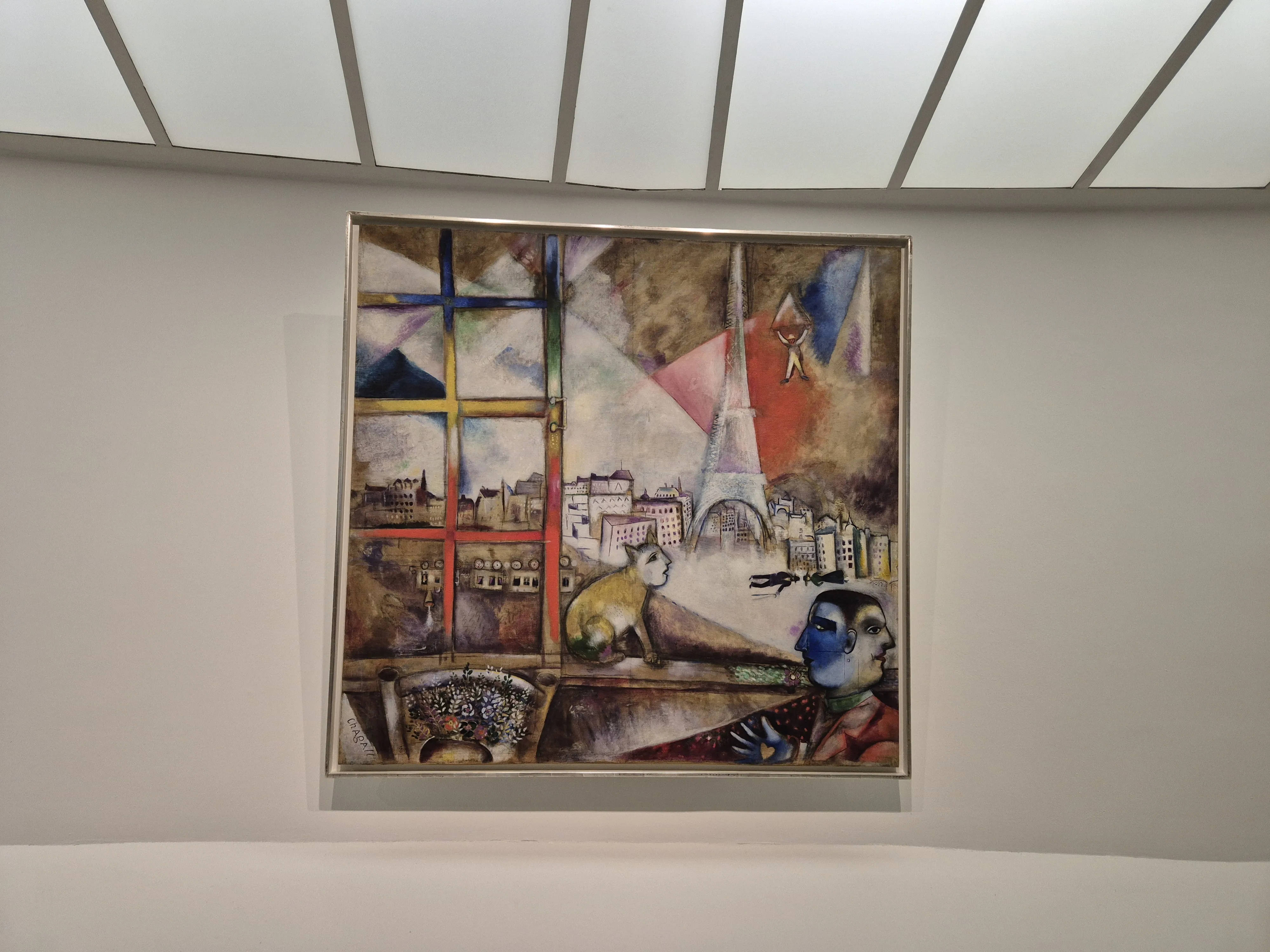 <창문으로 본 파리>는 샤갈 특유의 선명하고 강렬한 색채가 돋보인다. 붉고 노란 비현실적인 하늘, 사람의 얼굴을 한 고양이, 그리고 공중에 떠다니는 모티프들은 감정과 환상을 직접적으로 전달한다.