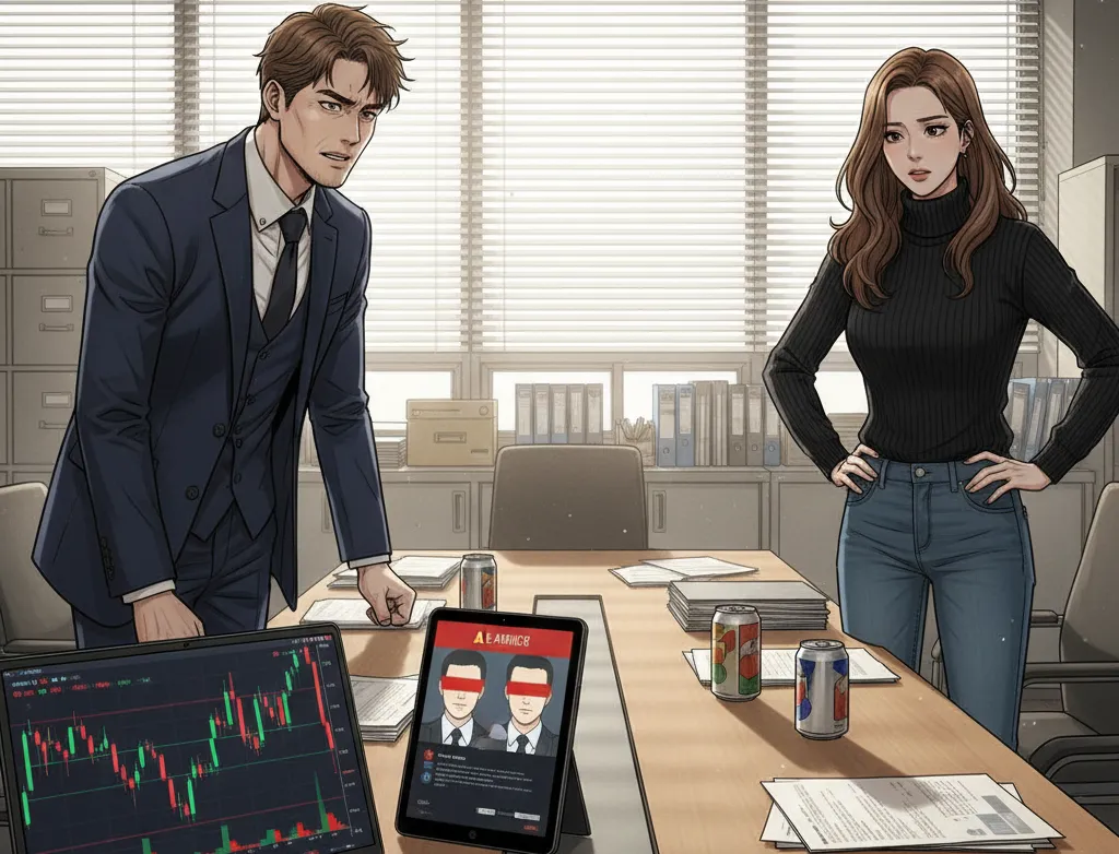 태성의 눈빛이 흐려졌지만, 결심만큼은 확고해 보였다. 유진은 심각한 표정으로 자리에서 일어나 복도 쪽 창문의 블라인드를 내렸다. 회의실 안이 일순간에 어두워졌다.