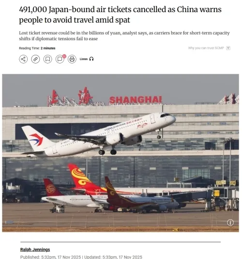 다카이치 사나에 일본 총리가 대만 유사시 자위대 개입 가능성을 시사한 뒤 중국 당국이 일본행 자제령을 내리자 항공권 수만 건이 무더기로 취소됐다.