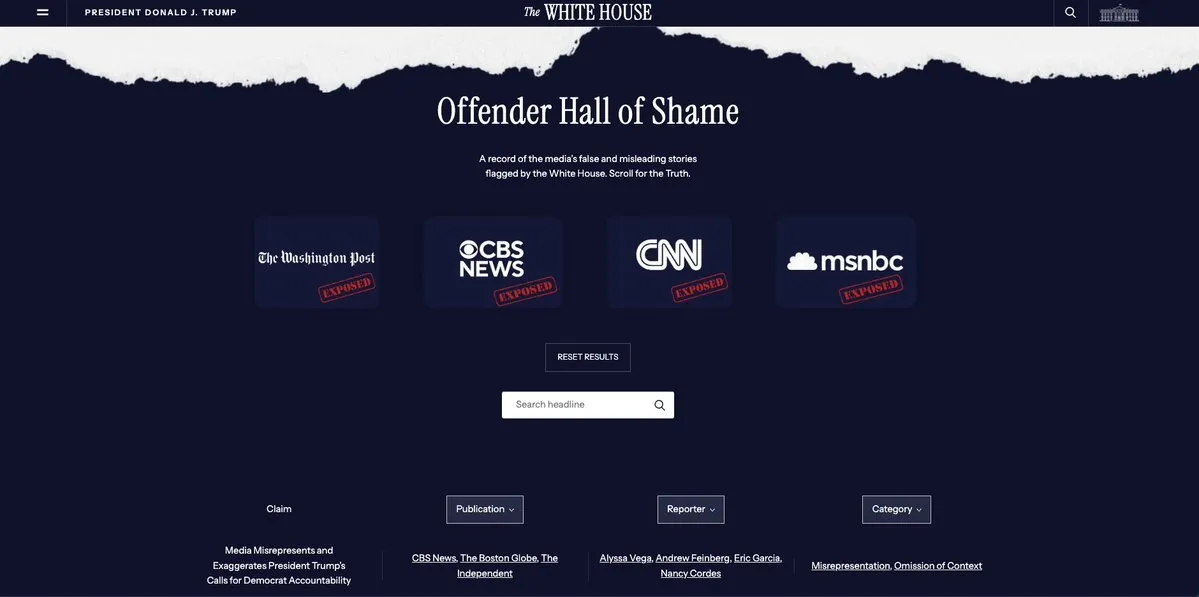최근 백악관은 자국 언론을 겨냥한 ‘미디어 범죄자’(Media Offenders) 페이지를 신설했다.