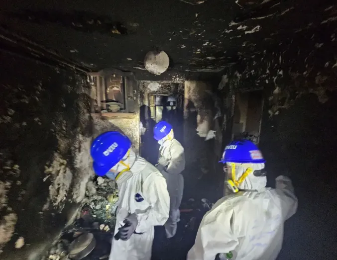 지난달 30일(현지시간) 홍콩 경찰은 화재 진압이 완료된 뒤 현장 내부를 감식하는 모습을 공개했다. 재난 피해자 식별반 소속 경찰들은 흰색 안전복과 마스크를 착용한 채 화재 아파트 내부를 샅샅이 조사했다.