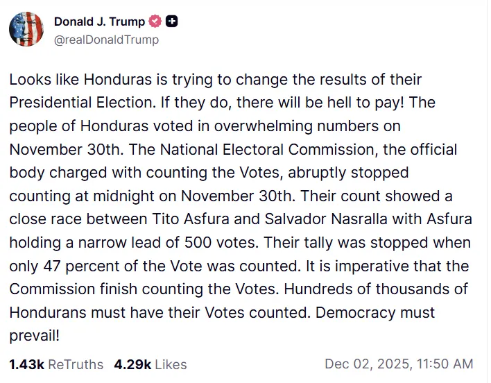 트럼프 대통령은 2일(현지시간) 자신의 소셜미디어인 트루스소셜에 “온두라스 선관위가 개표를 자정에 중단했으며 47%만 집계된 상태에서 티토 아스푸라 후보가 500표 차로 앞서 있었다”고 주장했다. 그는 “수십만 명의 표가 아직 남아 있다”며 “반드시 개표가 완료돼야 한다. 민주주의가 승리해야 한다”고 촉구했다.