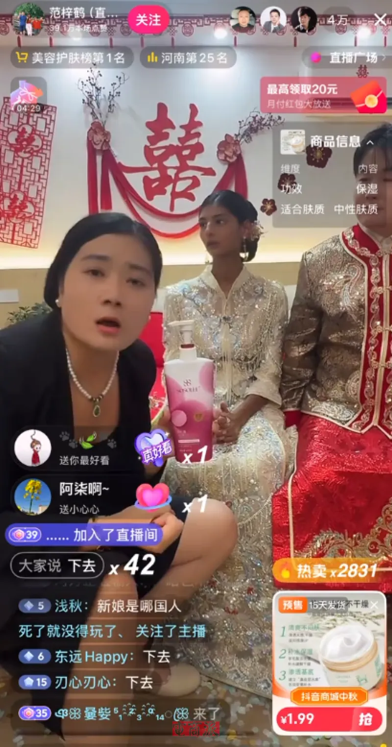 결혼 현장을 중계하던 화면에 샤오헤니의 고모라고 주장하는 한 여성이 갑작스럽게 등장했다. 이 여성은 1.99위안(약 380원) 보습크림과 99위안(약 1만 9000원)짜리 샴푸, 헤어드라이어 등을 차례로 소개했다.
