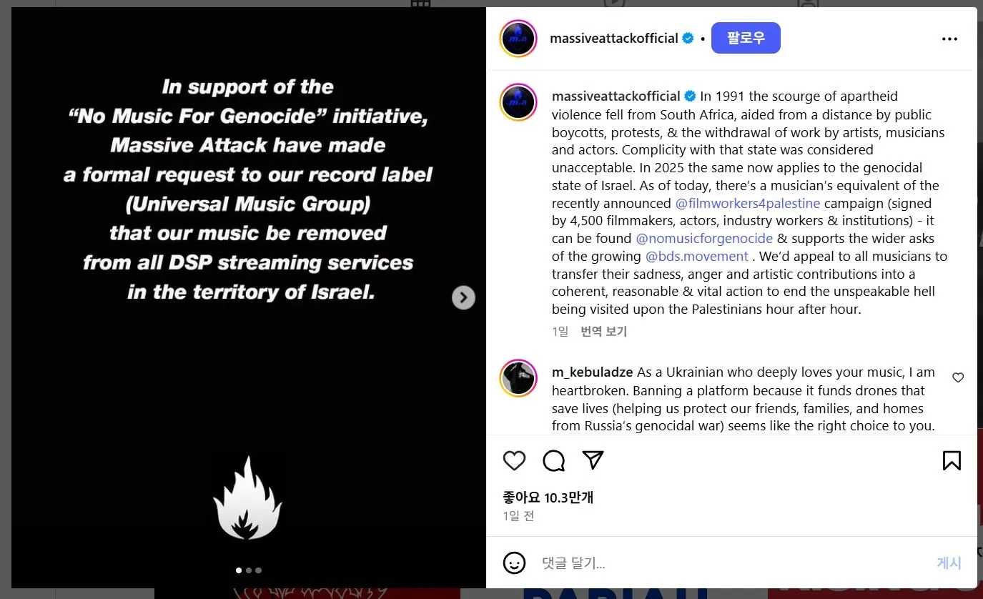 또한 밴드는 ‘노 뮤직 포 제노사이드’(No Music for Genocide) 캠페인에도 참여한다고 밝혔다. 이 캠페인은 이스라엘 내 스트리밍 서비스에서 음악을 중단하도록 아티스트와 레이블, 권리 보유자에게 요청하는 문화적 보이콧 운동으로, 가자지구 공격을 규탄하는 취지다.
