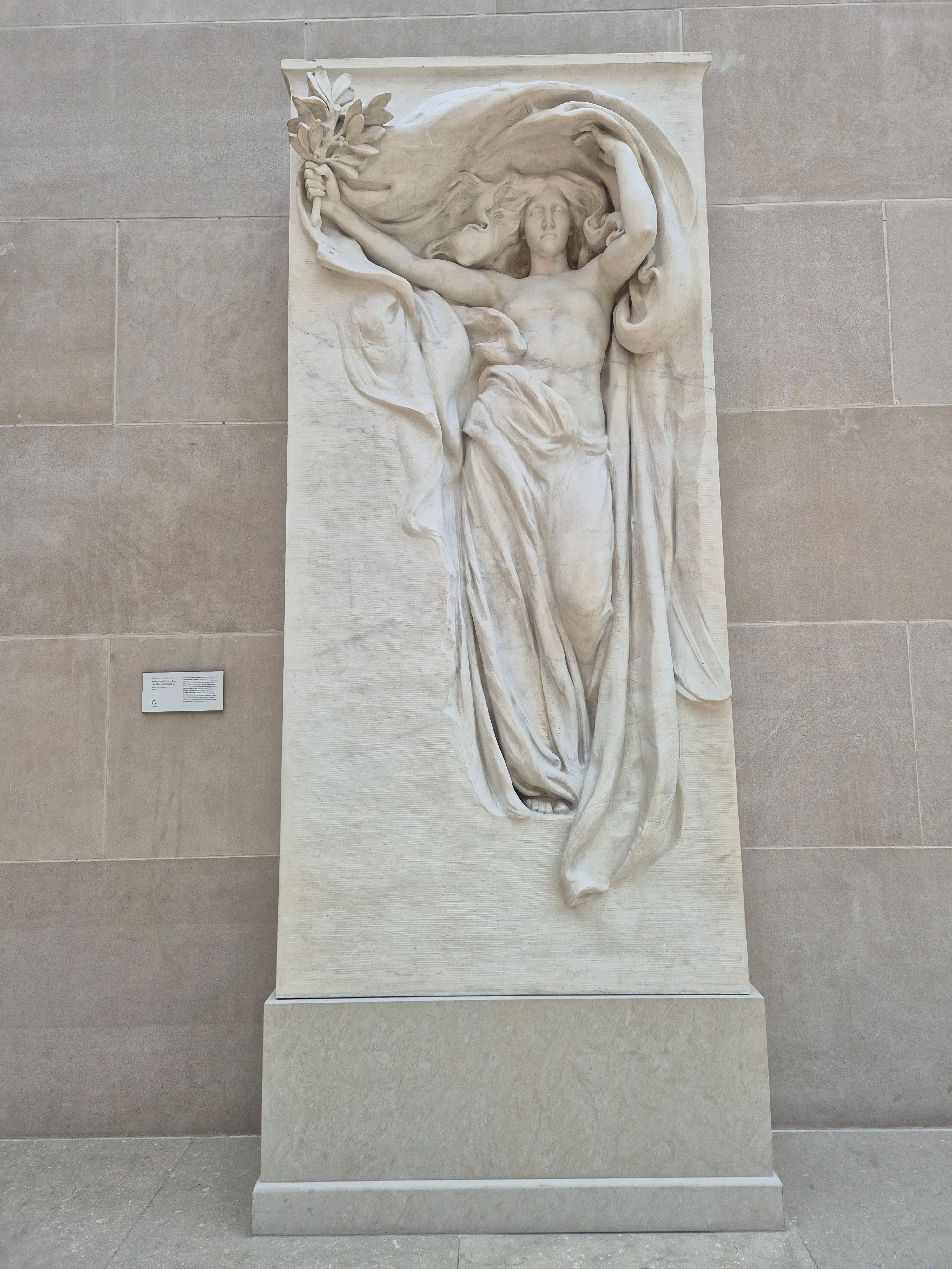 메트 버전에서 빅토리를 의인화한 이 여인상은 오른팔에 월계수 가지를, 왼팔에 성조기를 들어 ‘승리’를 상징하면서도, 시선은 아래를 향하고 표정은 엄숙해 ‘슬픔’과 ‘애도’의 무거운 감정을 동시에 담아낸다. 이처럼 공적인 기념비의 역할과 예술적 이상 사이의 긴장을 조화롭게 드러내는 것이 이 조각의 가장 큰 특징이자 힘이라 할 수 있다.