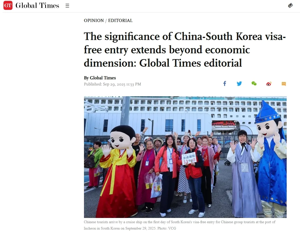 이 매체는 해당 사설을 통해 한국 관광 업계에서 중국인 관광객이 차지하는 비중이 크다면서 한국은행 보고서를 인용하기도 했다. 또 지난해 중국이 한국인에게 무비자 입국을 허용한 이후 중국은 일본과 태국을 제치고 한국인이 가장 선호하는 해외 여행지가 될 것이라고 내다봤다.