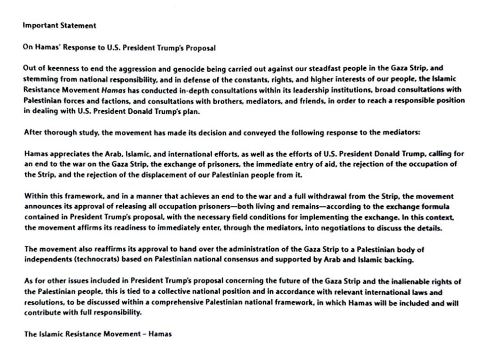 팔레스타인 무장 정파 하마스가 도널드 트럼프 미국 대통령이 제안한 가자지구 평화안을 조건부로 수락하겠다고 밝히며 본격적인 협상 국면에 접어들었다. 하마스는 인질 전원 석방 의사를 표명하면서도 이스라엘군 철수와 향후 팔레스타인 통치 체제에 대한 협의를 전제로 삼았다.