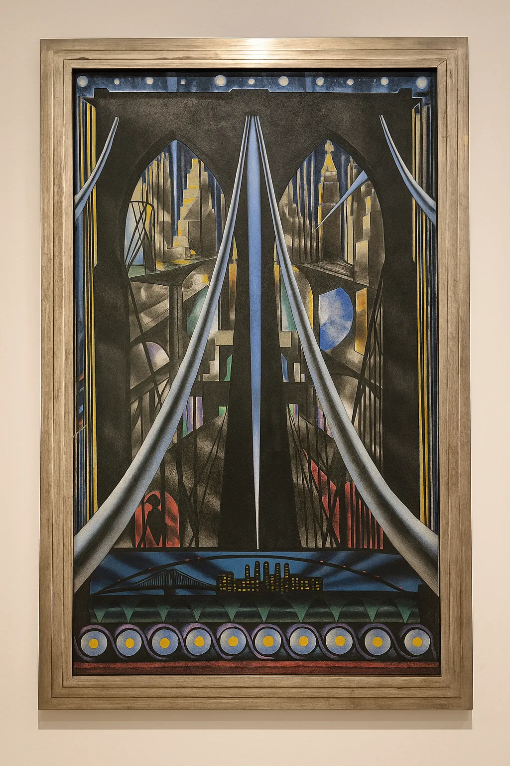 그에게 브루클린 다리는 단순한 건축물이 아니라 ‘산업화 시대의 대성당’이었다. 중세의 신앙이 고딕 성당의 첨탑을 통해 하늘을 향했다면, 근대의 신앙은 산업기술로 만든 다리의 현수선으로 하늘을 향했다. 화면에서 강철선들은 하늘로 향하는 기도하는 손이며, 빛의 파편은 마치 고딕 성당의 스테인드글라스를 통과한 신성한 빛처럼 반짝인다.