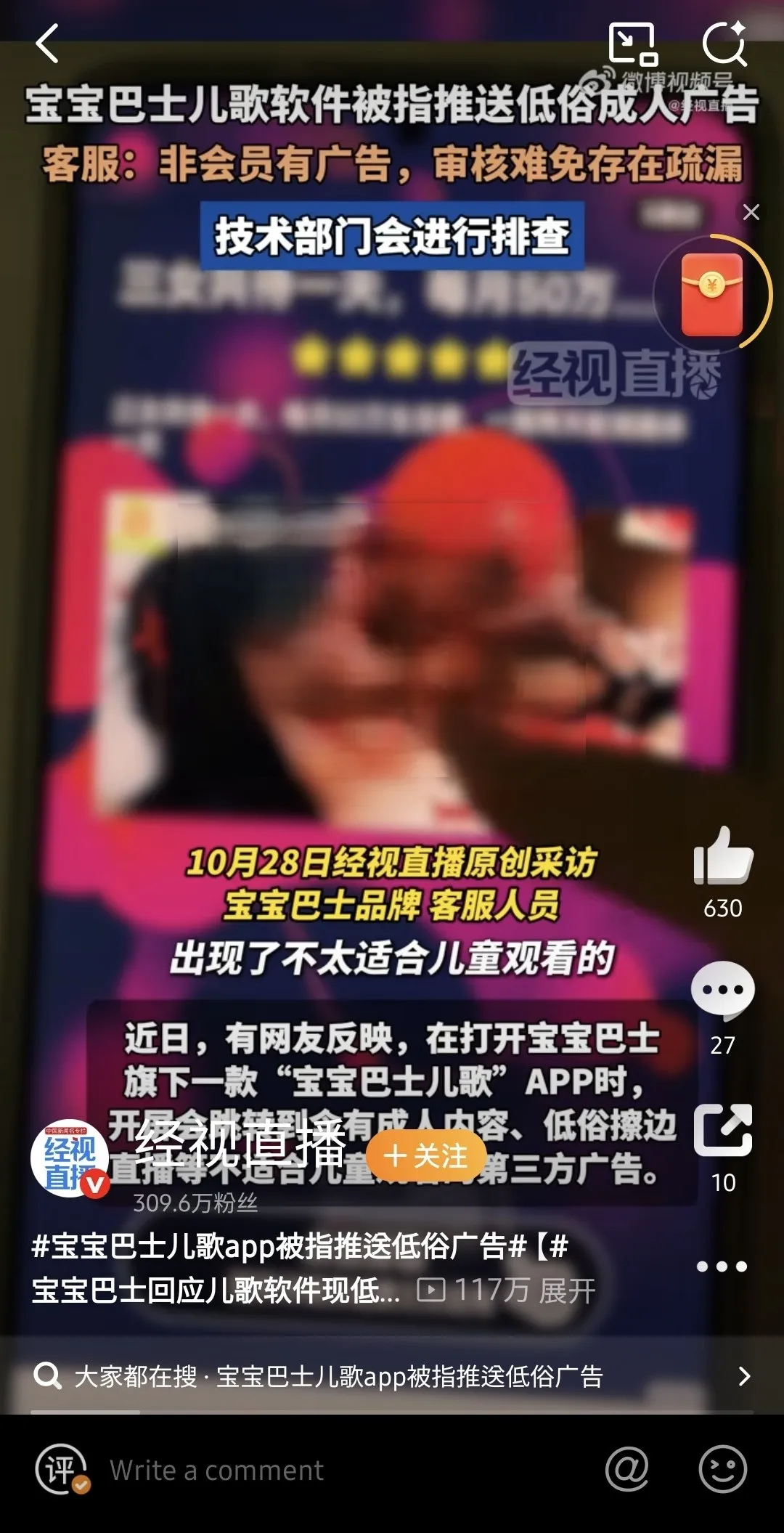 31일 중국 여러 매체 보도에 따르면 베이비버스 교육용 앱을 실행하자마자 부적절한 성인 광고가 나타났고, 심지어 이를 클릭했더니 외설적인 동영상까지 연결되었다는 것. 아동용 앱에서 아이들의 눈을 가려야 할 상황이 벌어진 것이다. 학부모들은 “나도 너무 놀랐는데 아이는 얼마나 충격적이었겠냐”며 보기 민망한 수준의 성인 영상이 자동으로 게시되는 것에 대해 온라인으로 분노를 쏟아내고 있다.