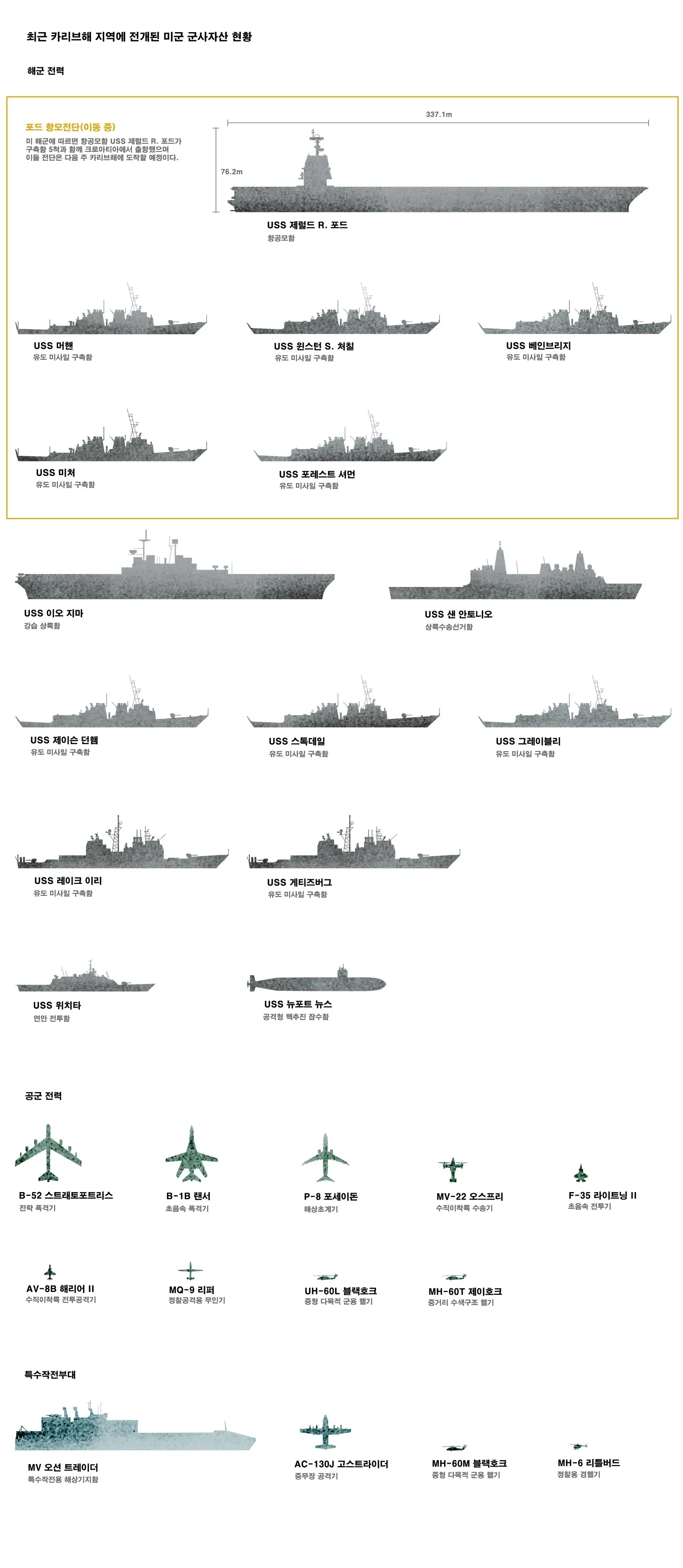 특히 베네수엘라 인근에 미군 병력도 대규모로 집결하고 있는데 미 언론은 약 1만 명 규모라고 전한 바 있다. 현재까지 카리브해 일대에 모여들고 있는 미군 전력은 항공모함 USS 제럴드 R. 포드 전단과 구축함 8척, 특수작전함, 핵 추진 잠수함과 공중에는 F-35 스텔스 전투기, B-1B 랜서 폭격기, AC-130J 고스트라이더 건십, MQ-9 리퍼 무인공격기 등이다.
