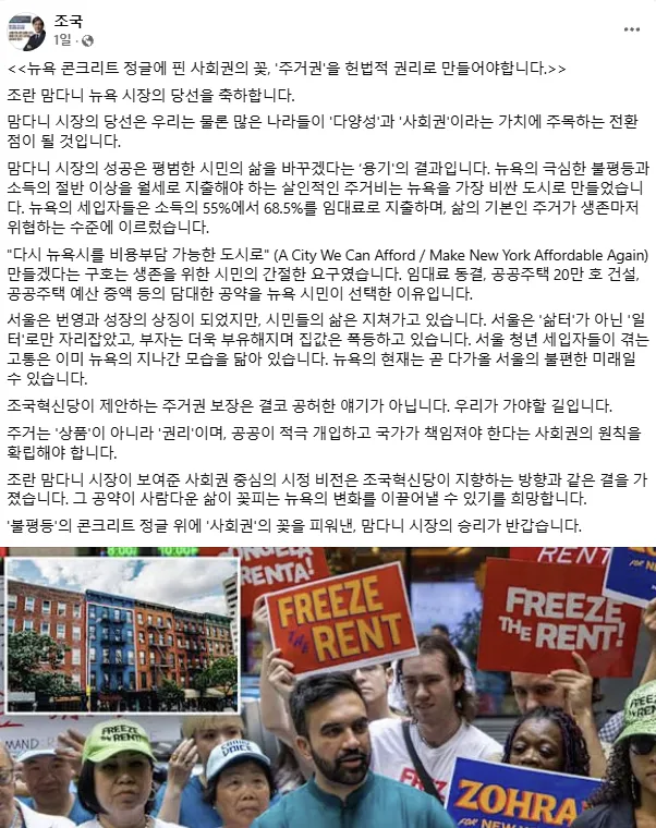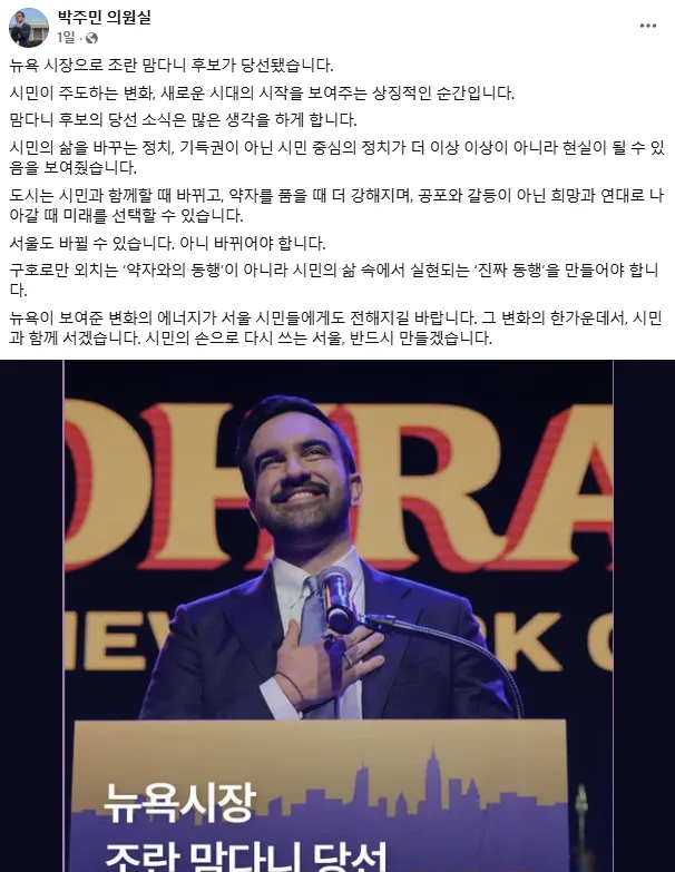 또 “불평등의 콘크리트 정글 위에 ‘사회권’의 꽃을 피워낸 맘다니의 승리가 반갑다”고 덧붙였다.