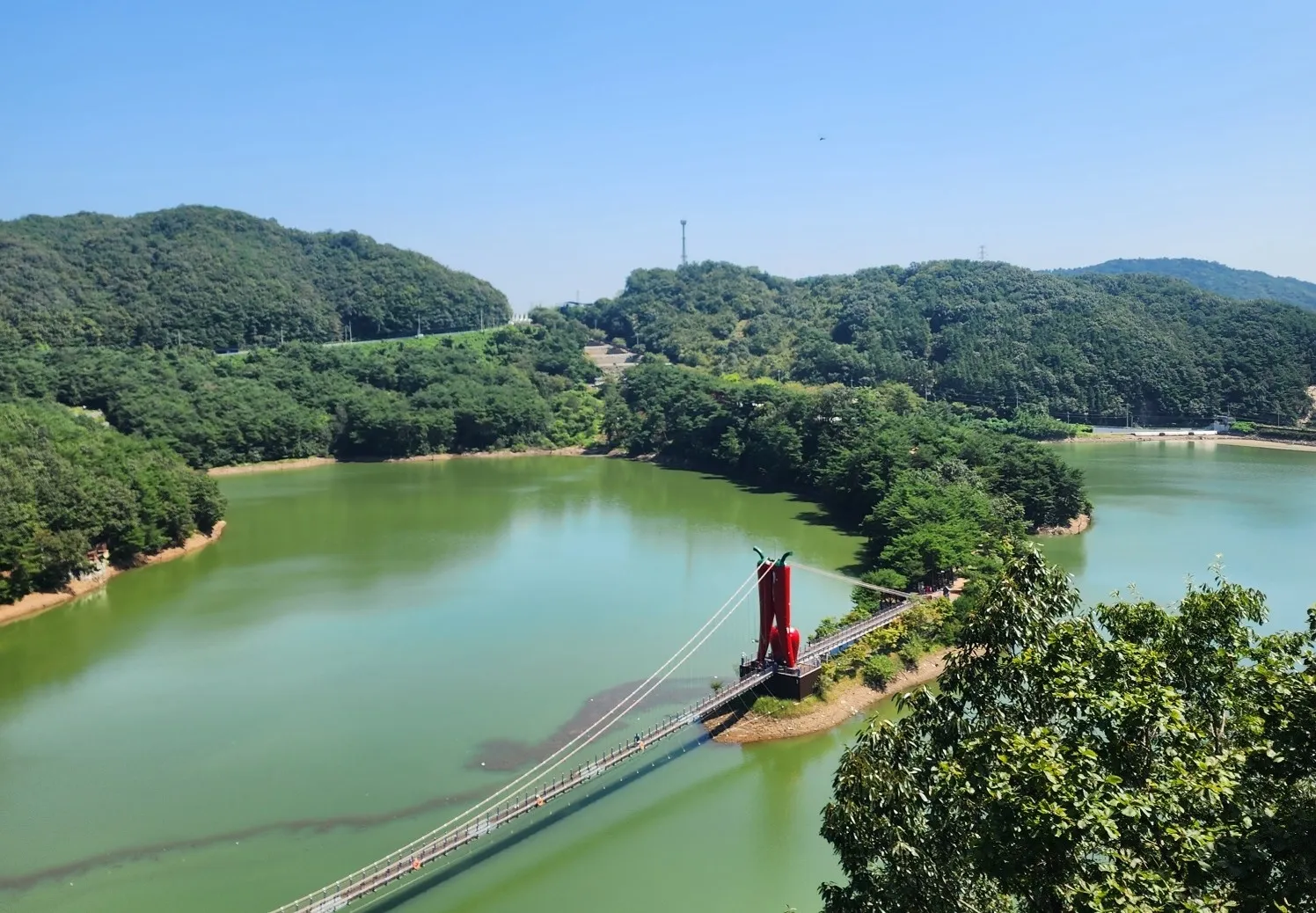 칠갑산의 백미로 꼽히는 천장호 출렁다리는 청양을 대표하는 관광 명소이다. 높이 16m의 고추 모양 주탑이 인상적이며, 총길이 207m의 다리 위에서는 칠갑산의 전경과 천장호의 수려한 풍광이 한눈에 들어온다. 출렁다리는 상하좌우로 흔들려 짜릿한 스릴을 경험할 수 있으며, 우거진 숲과 연결된 산책로가 잘 정비되어 있어 가볍게 걷기에도 적합하다. 유명 프로그램인 ‘1박 2일’ 촬영지로도 알려지며 많은 사랑을 받고 있으며, 특히 야간 개장은 풍성한 볼거리를 제공한다. 황룡이 다리를 만들어 아이의 생명을 구했다는 전설 등 다양한 이야기가 전해져 신비로움을 더한다.