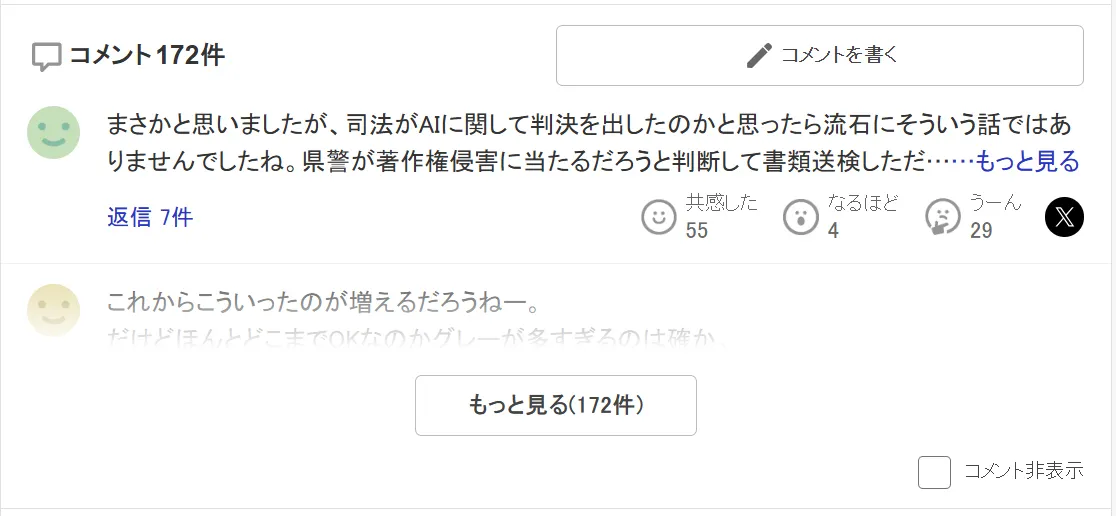 이번 보도가 올라온 일본 포털사이트 야후뉴스 재팬 댓글에는 100건 넘는 의견이 달렸다. 다수 이용자는 일본 국회가 AI 시대에 맞는 저작권 기준을 서둘러 마련해야 한다고 주장했다. 생성형 AI라고 해서 저작권이 없다고 단정하는 시각은 잘못이라는 의견도 이어졌다. 온라인 이용자들은 사람이 프롬프트와 수정 과정을 거치며 창작에 기여했다면 보호 대상이 되는 것이 자연스럽다고 평가했다.