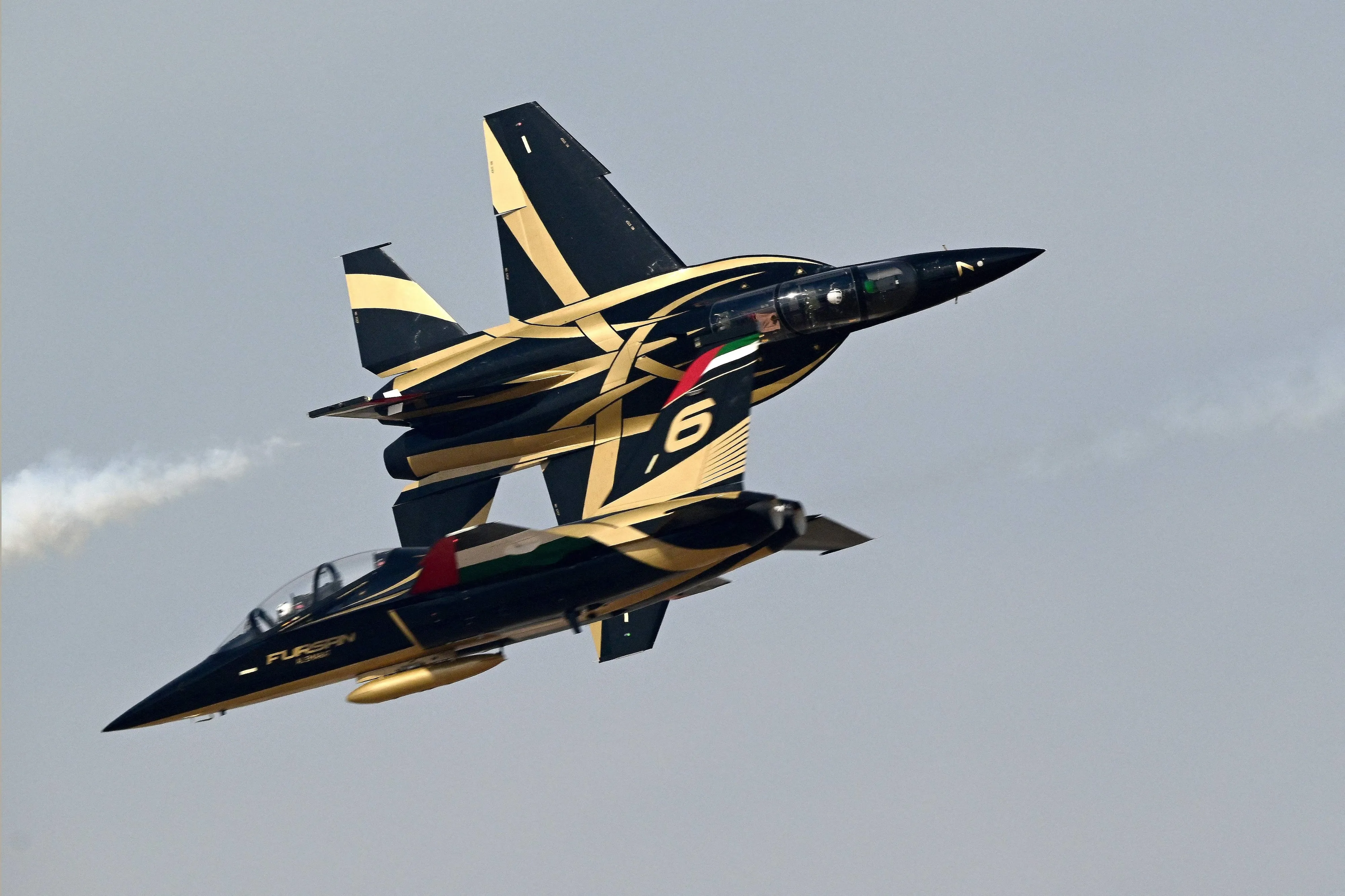 행사 첫날에는 UAE 공군 곡예비행팀 ‘푸르산 알 에마라트’가 중국산 L-15 훈련기로 첫 공개 시범비행을 펼쳤으며 검은색·금색 기체가 UAE 국기 색 연막을 남기며 편대 비행을 선보였다.
