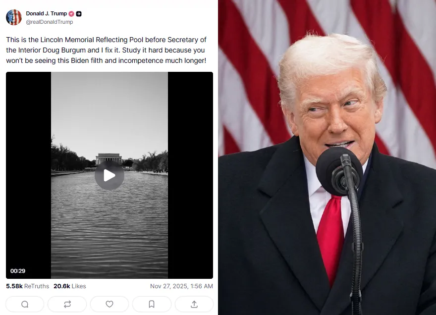 전문가들은 이 연못이 1923년 완공된 유서 깊은 시설로 특정 정권이 만든 것이 아니라 워싱턴 기념탑과 링컨기념관을 반사하도록 설계된 국가 상징물이라고 말한다. 최근 항공 촬영 사진은 바닥에 이끼와 침전물이 쌓인 모습을 포착했다.