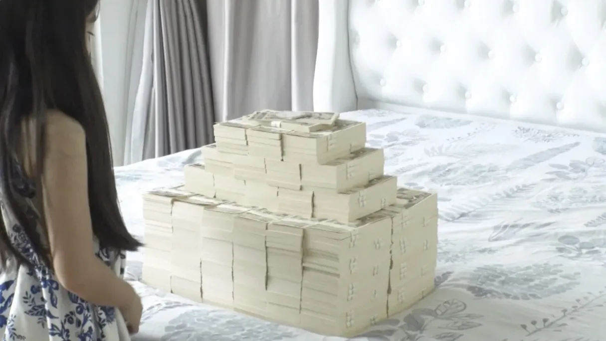 ▲ 말레이시아의 한 대형 저택에서 일본인 남성의 개인 침실 침대 위에 쌓인 현금 다발을 제2부인이 바라보고 있다. 해당 장면은 “동기부여를 위한 것”이라는 설명과 함께 방송을 통해 공개됐다. 아메바(ABEMA) ‘사랑의 하이에나 시즌5’ 캡처