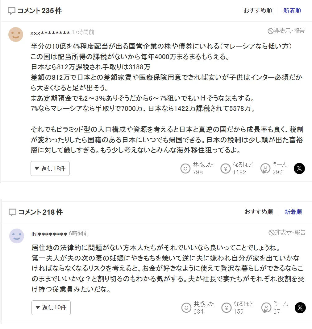 ▲ 말레이시아에서 일부다처 생활을 하는 일본인 가족을 다룬 방송 이후, 야후재팬 댓글창에서 가장 많은 공감을 받은 반응들. 세제·자산 운용 관점에서의 현실적 계산과, ‘합의된 관계라면 문제없다’는 시선이 나란히 드러난다. 야후재팬 캡처